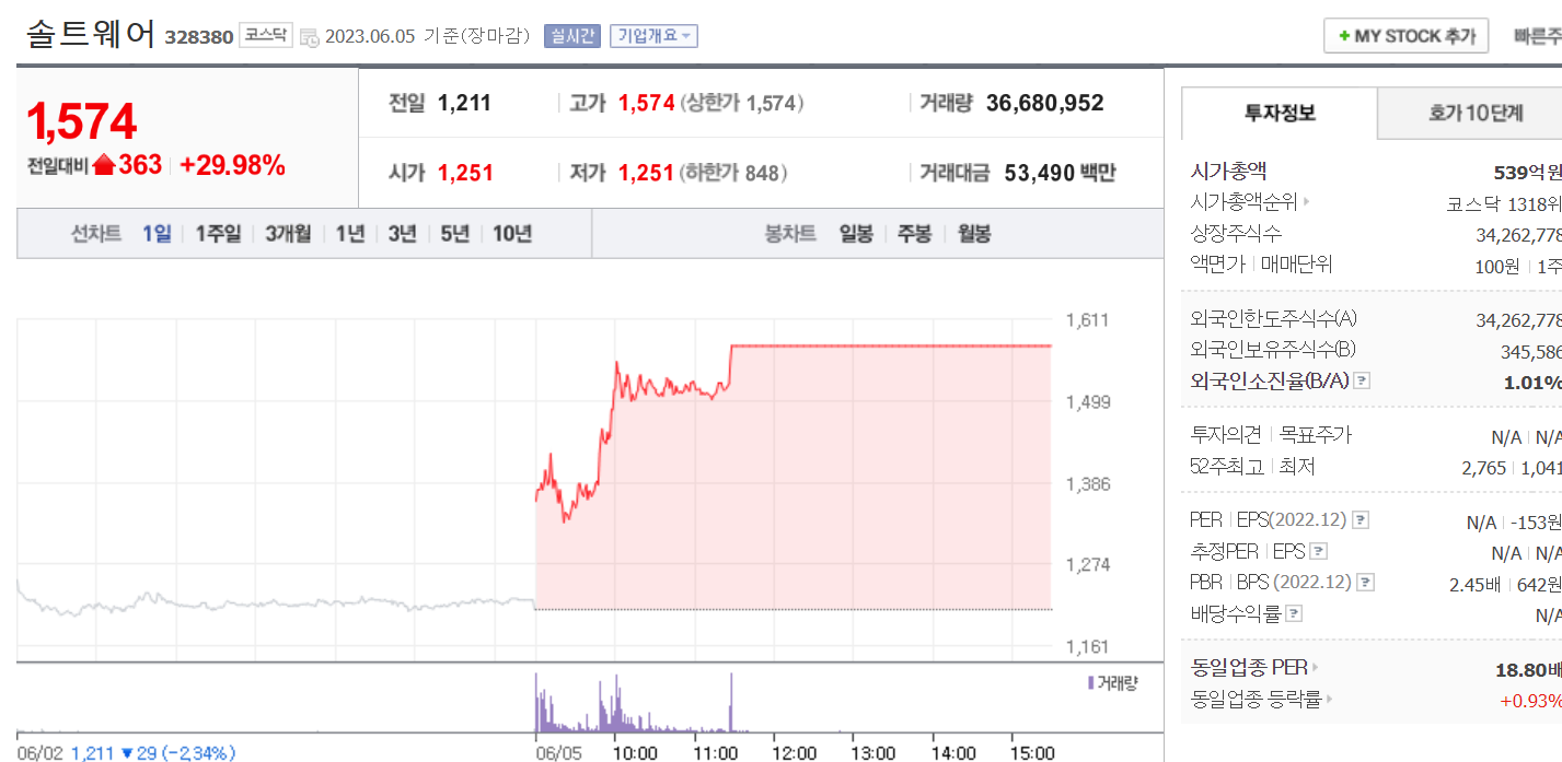 1일 12.32% 상승폭 이후 2일 2.34%의 낙폭을 기록했지만 5일 29.98% 오른 1574원에 장을 마쳤다.